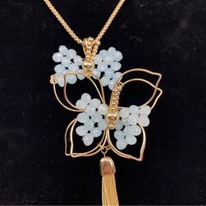 Gold tone metal, Pale blue beads, 3D bent wire butterfly, Beaded butterfly, Chain tassel, Extra long length, Adjustable length, Lobster claw clasp
