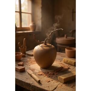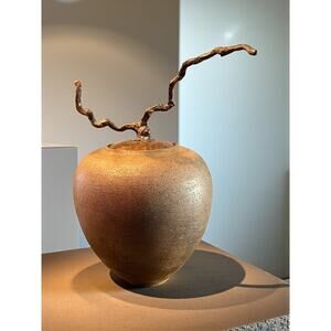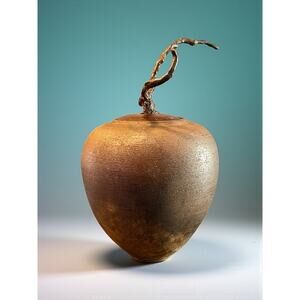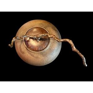 Elegant studio pottery vessel signed “C Green” to the base. This is her contorted filbert design. These wheel-thrown mica clay vessels are unglazed and raku fired. Satin, ember-brown surface and a sculptural bronze vine finial on a fitted lid—an artful nod to the American studio-ceramics movement that flourished in the late 20th century. Likely c. 1990's, the piece shows the era’s organic forms and understated, wabi-sabi palette, ideal for Japandi, Rustic Modern, Brutalist, or Traditional interiors. From a well-kept private estate collection of studio ceramics. Measures 14.5" H x 8.5" W overall. Displays beautifully on an entry console or mantel as a focal, one-of-a-kind object.