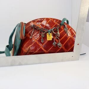 Unique Carol Hearty handmade half-moon art bag featuring a striking mix of materials, colors, and textures. This artisan piece blends a glossy quilted rust-orange leather body with teal leather straps and polka-dot accented sides. The exterior is decorated with an eclectic chain of dangling charms, giving the bag a whimsical, storytelling feel—signature to Carol Hearty’s one-of-a-kind functional art.