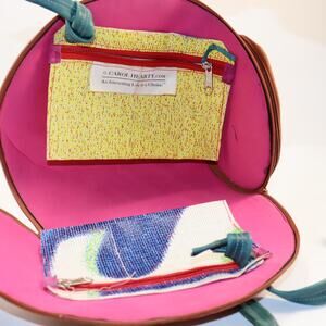 The interior opens wide with a zip-around closure and is lined in vibrant hot pink, with multicolor textile pockets and zip compartments. One interior pocket is partially loose at the stitching, but still usable. Label reads: “CAROLHEARTY.com – An Interesting Life is a Choice™.” Approx. length is about 14–15" based on the ruler in the photo.