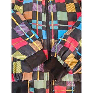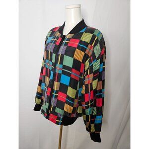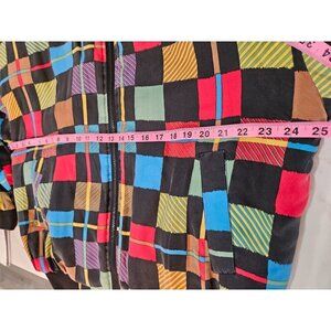Crafted from luxurious silk, this Carol Horn Workshop bomber jacket, jogging suit jacket combines vibrant colors in a striking patchwork checkered design. The "Jockey Flag" Bomber design is eye-catching and the multi-color geometric/ color block pattern adds a touch of playfulness. Made from 100% silk, this jacket is luxurious and comfortable to wear. Make a statement with this timeless piece.