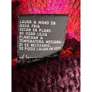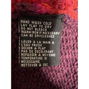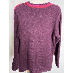 Vibrant Carol Little Knit Wear pull over Sweater featuring a unique fish design in shades of purple, pink, and red. This artsy, boho chic piece, made in China, is a blend of ramie, cotton, mohair wool, and rayon. The garment is a small size with a chest of 19 inches, length of 27 inches, sleeve of 22 inches and shoulders of 16 inches.