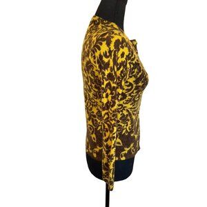 Elegant and warm cardigan crafted from a luxurious lambs wool and angora blend. Features a distinctive yellow and brown floral pattern, button closures, and a tailored fit.