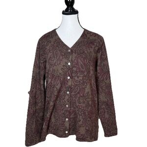 This Carole Little cardigan sweater is perfect for fall office wear and Thanksgiving dinner. It features a soft knit blend made of 70% Lambswool, 20% Angora (Rabbit Hair), and 10% Nylon. It is a long-sleeved, has a V-neck and is full button closure. The primary colors are brown and burgundy and features an all-over floral paisley-like jacquard knit pattern