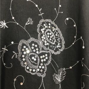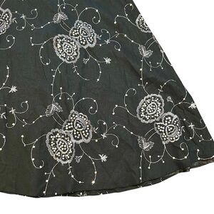 Chic black midi skirt with delicate floral embroidery. Perfect for versatile styling.