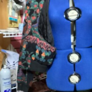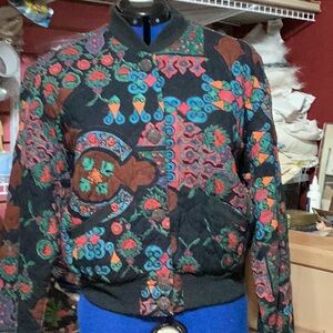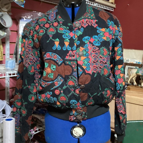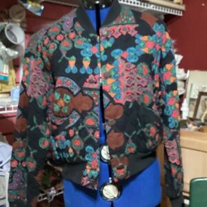Vibrant jacket with intricate patterns. Features a mix of colors. Button-up front. Perfect for a bold look. Dress up your jeans add this beautiful jacket go in style.