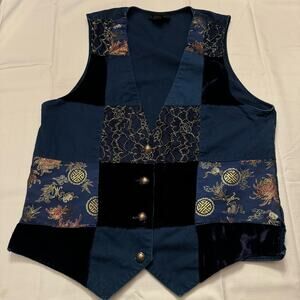 This Carole Little Sport vest is a striking example of vintage patchwork fashion, featuring an eclectic mix of velvet, brocade, lace, and cotton fabrics. Made in the British Crown Colony of Hong Kong, this size 12 vest showcases Asian-inspired metallic embroidered panels, elegant gold-tone filigree buttons, and rich textures in navy, black, and gold tones. Perfect for lovers of boho, avant-garde, or 1990s eclectic style, it makes a bold statement whether worn layered or as a standalone piece.