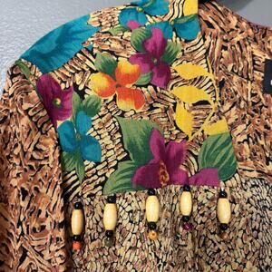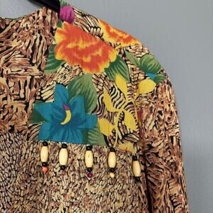 Women's vintage lightweight safari style long blazer by Carole Little from the 1990's. This funky leopard print blazer has a floral print on the shoulders and front pockets, a belted waist, and beading at the shoulder. It is 100% rayon.