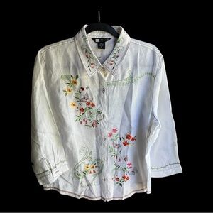 Carole Little White Shirt with Colorful Floral Embroidery - NWOT