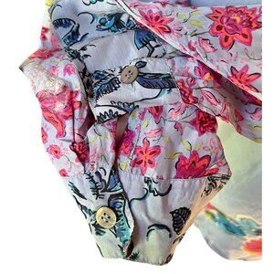 This Carole Little silk shirt dress features vibrant floral and island-themed prints combined with a button-up design. Its long sleeves and light silk fabric make it versatile for a polished yet unique look.