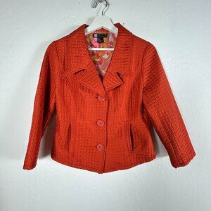 Add a pop of color to your wardrobe with this Carole Little quilted blazer in rich orange silk. Featuring a smooth lining, 3/4 sleeves, and a classic button-front closure, it blends comfort with standout style. Perfect for layering over casual or dressy outfits, this piece offers a touch of vintage charm with modern versatility.