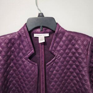 Carole Wren 3/4 Sleeve Open Front Quilted Purple Long Duster Jacket. This jacket is light weight with pockets on the front. Slit on each side at the bottom for more movement. This jacket is in excellent condition.