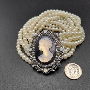 *Description: This is a beautiful Carolee Cameo bracelet with nine strands of faux pearls attached to an iridescent Cameo framed in rhinestones atop a magnetic clasp. The bracelet looks to have rarely, if ever, been worn. This would be a great addition to your jewelry collection or make a great gift!