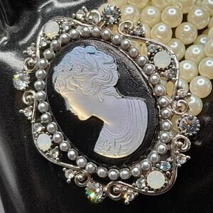 Carolee Cameo Faux Pearl Bracelet, Magnetic Clasp, Glass Cameo Rhinestones