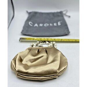 Carolee Mini Handbag Gold Satin Beaded Handle Evening Clutch Kiss Lock Purse In Very Good Pre-owned Condition. No rips or stains. Inside is clean. Small pulls to the satin on one side of the bag. Please see the pictures. Includes dust bag.