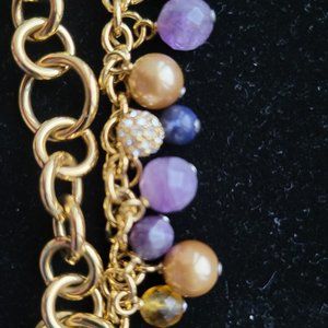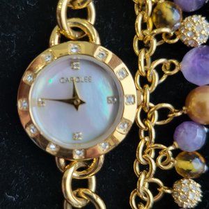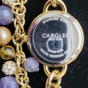 Carolee New York Bracelet. Watch has chain band as well as attached bracelet with Various style Beads with rhinestones, metallic gold colored, clear gold when lavender faceted. Crystals around face of watch. Face is iridescent in color. Water resistant and stainless steel backing. Need new battery.