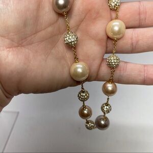 - this necklace boasts beautiful pave crystal & tonal gold hand-polished simulated pearls linked by tiny gold-tone chains.