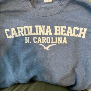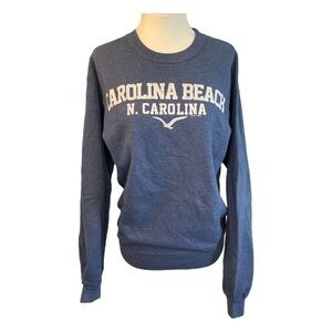 Jerzees Outer Banks Sweatshirt to remember your vacation to the Outer Bank and Carolina Beach in North Carolina. It is a Heather Navy Blue, has a crewneck, long sleeves and is a pull-over style. The Graphic Design Print on front are the words Carolina Beach, N. Carolina and a Sea Gull.