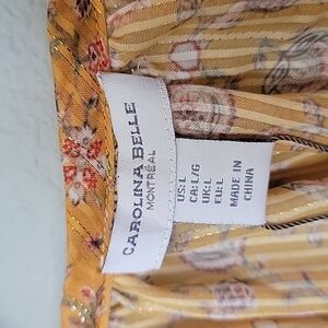 This top is tagged as a large, however it is very oversized and could even fit up to an XXL in my opinion. Color is yellow with thin gold thread throughout. Split neck with strings to tie at the neck or be worn open. Top is sheer. There is elastic at the wrist. Has a boho floral pattern all over. Fabric itself is lightweight and doesn't stretch. Ditzy floral, elegant, statement, vibrant, church, brunch, workplace, professional, elevate, interview, dinner, date night, shimmer, shine, spring, summer, dressy, fall, autumn, bold, girly, feminine