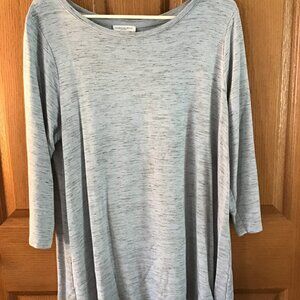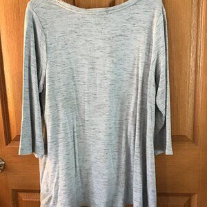 Carolina Belle Montreal Top, 1Z sky blue with black "streaks" through it, scoop neck, 3/4 sleeves, Very soft, 93% Rayon, 4% Elastane, 3% Polyester