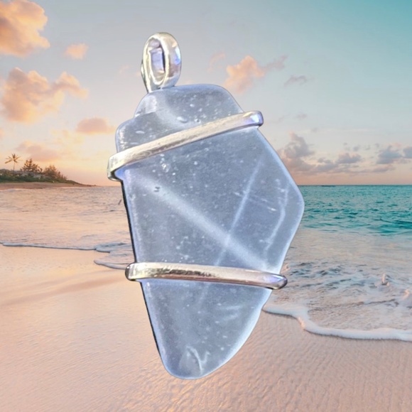 Beach glass pendant is new and in excellent condition. The suttle blue is delicate and soothing. Handcrafted with Silver Plated Base in Mexico, base metals are a mixture of copper & tin. 17” Chain included.