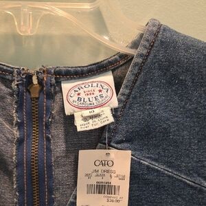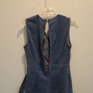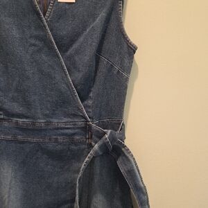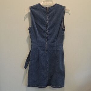 Brand new with tags! This stylish sleeveless faux wrap-style dress in medium wash denim is perfect for a casual day out or dressed up with wedges and accessories. Features a side tie belt and back zip closure for a flattering silhouette. Great for year-round wear—layer with a cardigan or wear alone for summer!