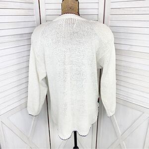 Vintage 80s 90s, Cream ivory white, Floral with plaid midsection, Crew neck, Long sleeve, Shoulder pads, Chunky knit, Tunic length, Contrasting hem