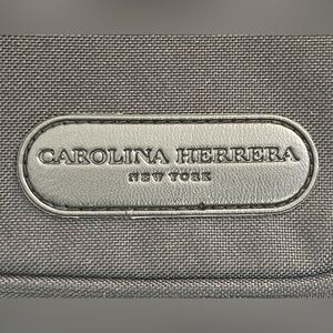 This Carolina Herrera laptop bag in black is crafted from durable materials, featuring a sleek geometric design. Perfect for business or tech accessories, it combines functionality with a sophisticated look.