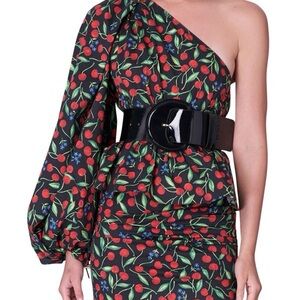 Stylish one-shoulder top. Features vibrant cherry print. Perfect for a bold look.
