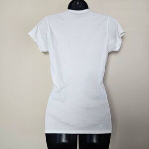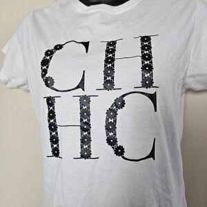 This is a short sleeved white t-shirt by Carolina Herrera. It features CHHC covered in flowers, printed in black on the chest. Note some wash wear as shown in the photos.