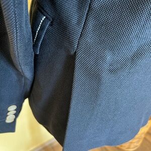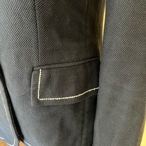 Sophisticated dark blue blazer with white stitching. Features classic lapels and button closure. Two pockets and no lining. Chest: 18”, length: 22.5”, sleeve length from shoulder line: 23”, shoulder: 15.5”, very good condition size 2