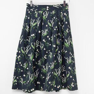 Carolina Herrera Midi Skirt Lilly of the Valley Print Navy Blue Green Cream Size 4. Elevate your wardrobe with this Carolina Herrera midi skirt featuring the iconic Lilly of the Valley print. Crafted in Italy with a flattering full silhouette, it’s a timeless piece perfect for both work and special occasions.