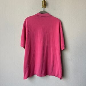 Carolina Herrera piqué polo shirt in geranium pink. Features classic polo styling with two-button placket, embroidered CH logo at chest, and side vents. Made in Portugal. Size XL - 23" pit to pit; 28" total length