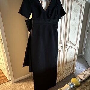 This elegant black dress features a stunning bow detail, perfect for any special occasion. Its classic design ensures you will look sophisticated and stylish.