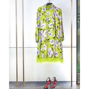 Carolina Herrera Silk Mini Dress M Feathers Long Sleeve Green Floral Neck Tie