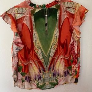 Beautiful flamingo motif. Sustainable viscose. Purchased in August 2022. Wore once to event. Colors not good for my skin tone. Beautiful airy blouse, perfect for Spring fun!
