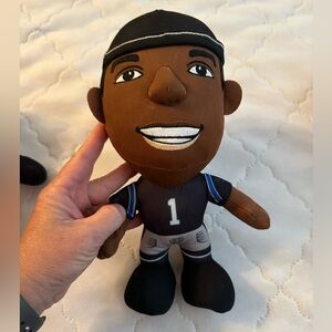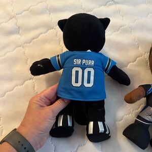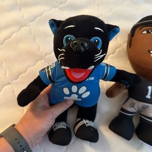 Carolina Panthers Mascot Sir Purr plush & former player Cam Newton plush. Sir Purr has a small hole on back of left arm (see pic). Smoke free home.