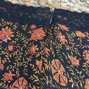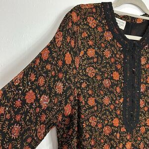This is a bohemian-style silk beaded dress with an all-over floral pattern in warm tones against a black background. It features a tunic-inspired design with a crew neckline with button closure framed by black lace detailing, adding a feminine touch. The dress has long sleeves with lace trim and a relaxed silhouette, making it versatile for casual or dressier occasions