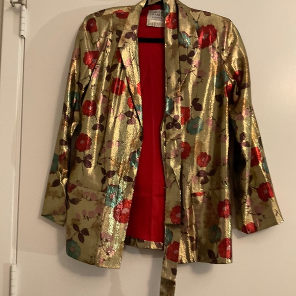 Exquisite gold jacket. Worn once. Made in ENGLAND. SIZE 8. Lined in red. Belt 40”. Length approximately 26” shoulder to shoulder 14”. Very soft. VINTAGE. SHOULDER PADS SEWED IN LINING. BEAUTIFULLY MADE. FROM STORAGE. 67%silk,33% polyester.