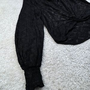 Caroline Costas Bette Blouse. Gently preowned in excellent condition. No stains or holes. Pit to pit 20 Length 23" front 25.5" back V-Neckline tiny snap button at chest Twist front Solid Black floral print Smocked cuffs 51% Viscose 49% Acetate We ship fast, Your item will ship out The Next Business Day!!! *STOCK PHOTOS ARE FOR REFERENCE FIT ONLY, FIT IS THE SAME* Excellent used condition. measurements are in photos NO LOWBALL OFFERS WE HAVE FEES