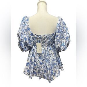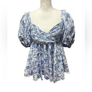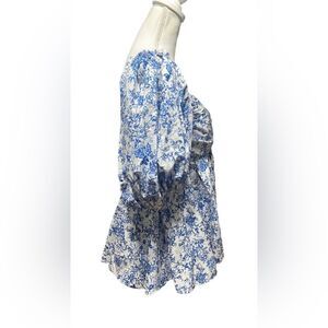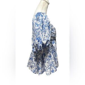 Caroline Constas Blue & White Floral Brie Puff-Sleeve Babydoll Top Sz M