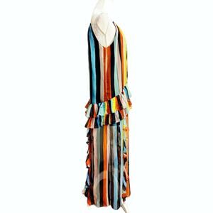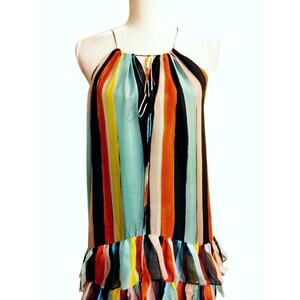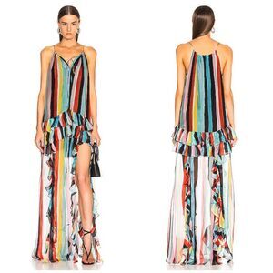 Caroline Constas Isla silk rainbow stripe maxi dress. Halter neck. Lightweight chiffon silk. Lining is shorter than the dress. Ruffled tiers at hips and ruffles on each skirt panel. 4 slits. Very faint pulls at the very bottom that cant be seen unless its in direct light held up. Stunning unique dress.