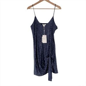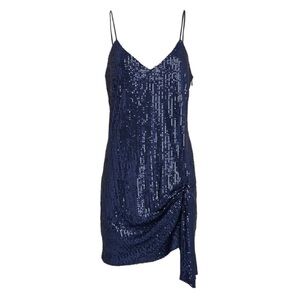 Draped along the hem for effortless glamour, the label's Koren mini dress is embellished in navy sequins. Side zip closure.