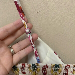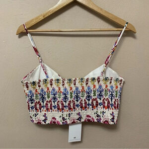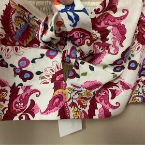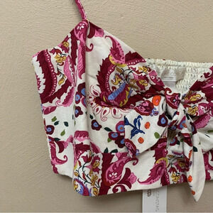 Keywords: summer, crop top, linen top, feminine, flirty, floral, vacation, resortwear resort wear, travel, beach, warm weather, travel, coastal, tropical vacation, multicolor