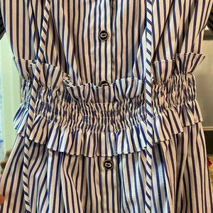 An off-shoulder Caroline Constas dress crafted in shirt-striped cotton. Smocked elastic at the neckline, waist, and cuffs. A drawstring tops the full-length button placket.
