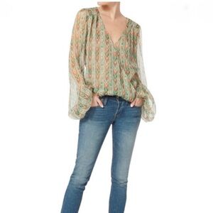 This wrap-effect blouse features a gold-threaded chevron print for a boho-chic finish. Wrap-effect, deep V-neck. Long sheer sleeves with elasticized cuffs. lightweight and semi sheer