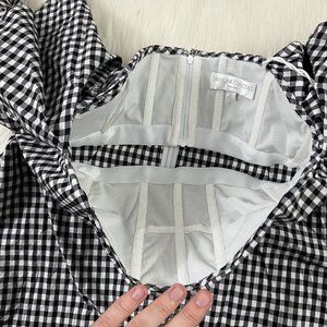 Caroline Constas Size Small Black and White Gingham Plaid Off The Shoulder Mini Dress, Triple Wide Bell Sleeves, 100% Cotton, No Stretch, Unlined, Boning in Corset Top with Zipper, Hidden Back Zipper, No Pockets