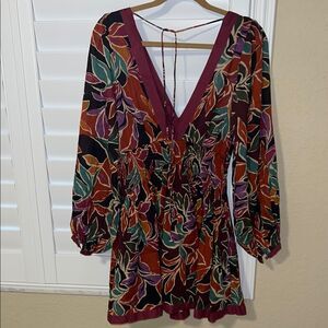 This Caroline Constas dress features a vibrant red and orange wrap design, offering a relaxed fit with 3/4 sleeves. Its artistic floral pattern adds a touch of elegance, making it a versatile piece for any occasion.