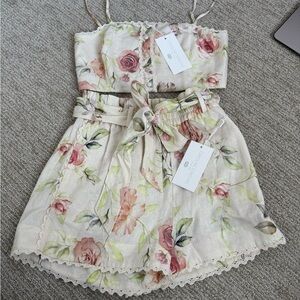 Caroline Constas-NWT Ivory Linen Muted Floral Scalloped Matching Short Tank Set