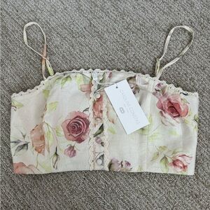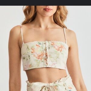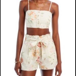 Beautiful muted linen shorts set. Shorts have scalloped trim and optional fabric tie belt. Matching cropped tank with buttons down center front. Beautiful multicolored floral print. Never worn with tags